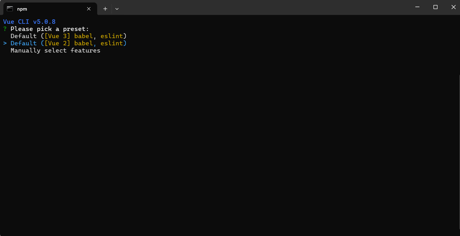 2、选择vue版本,这里选择的是vue2,然后等待文件的创建完成即可